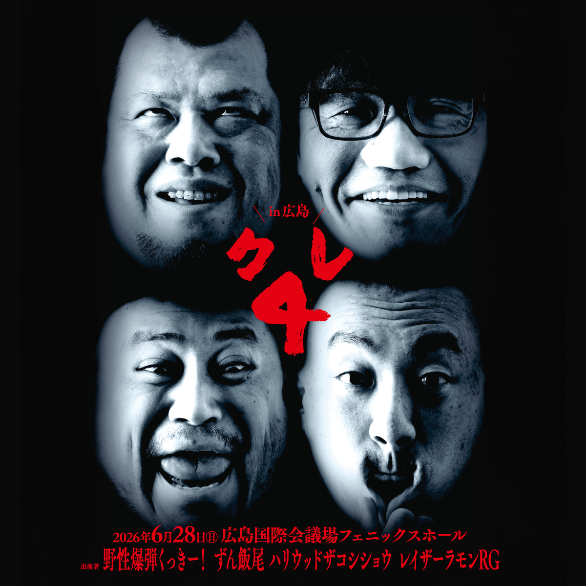 野性爆弾・くっきー!、ずん・飯尾、ハリウッドザコシショウ、レイザーラモンRGが、全開で好き放題する伝説のイベント 『クレ4』 ついに広島県初上陸!